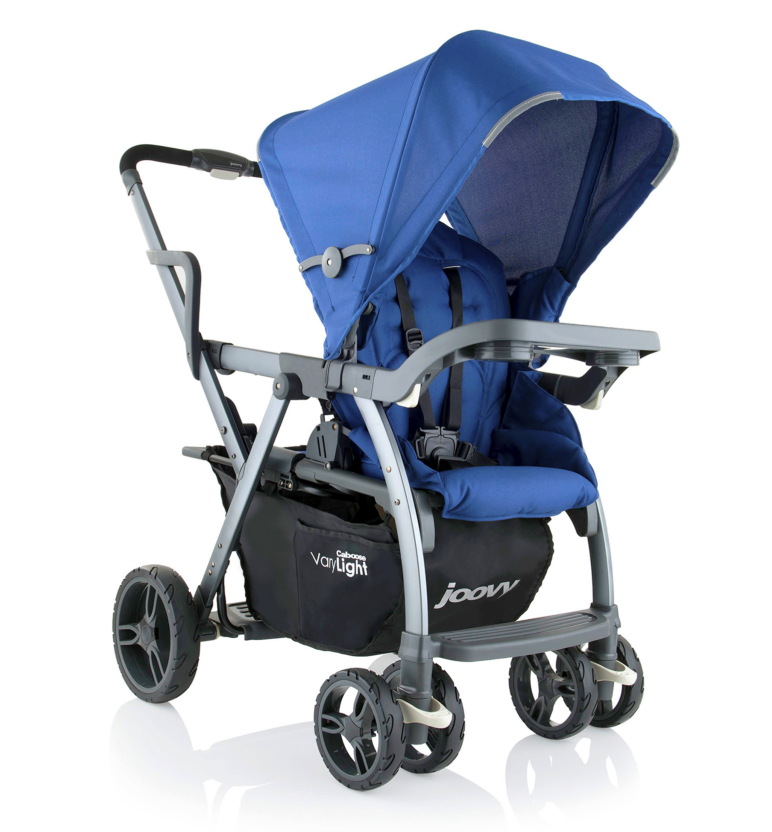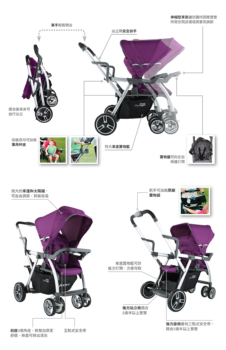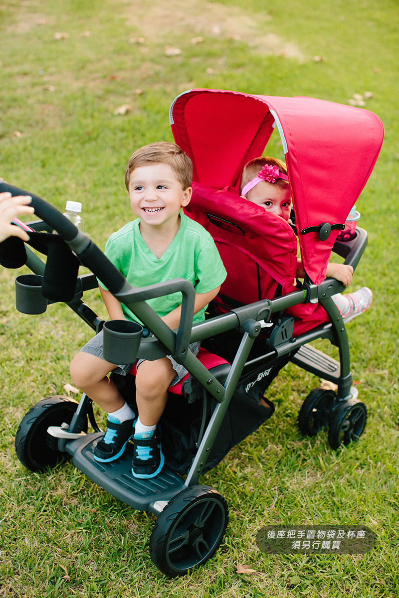 Joovy 首創具伸縮功能的兄弟車,車架能伴隨寶寶成長和所需空間作出調節,後座兼備座板及站立板,讓兩個寶寶都能得到最舒適的乘坐體驗,更具備單手開合功能!