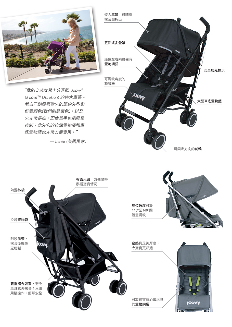 舒適、安全、實用,令寶寶外出時無懼驕陽,Groove Ultralight 的特大車篷、車底置物籃和比一般同類型嬰兒車更堅固耐用的車架,令它輕易成為媽媽們的安心之選!